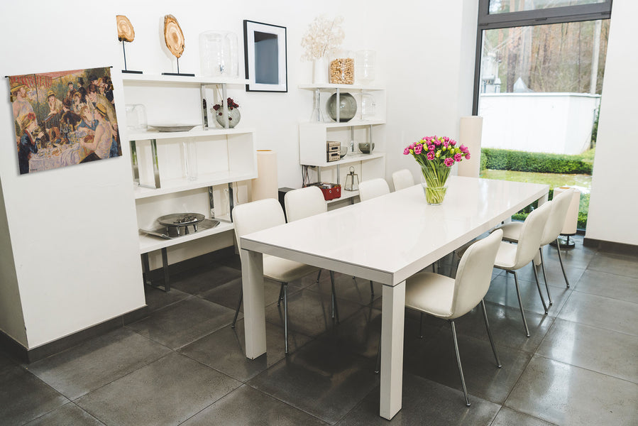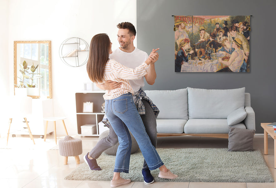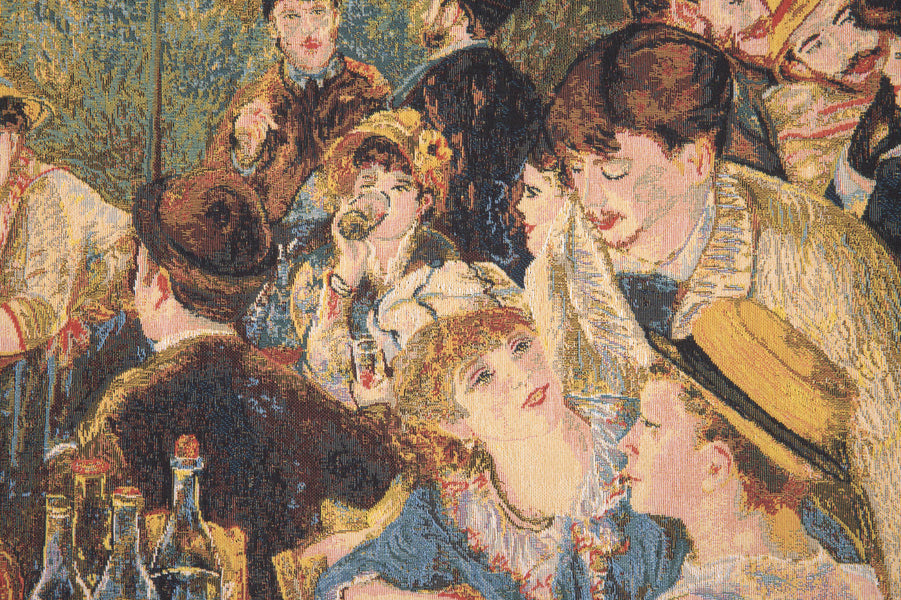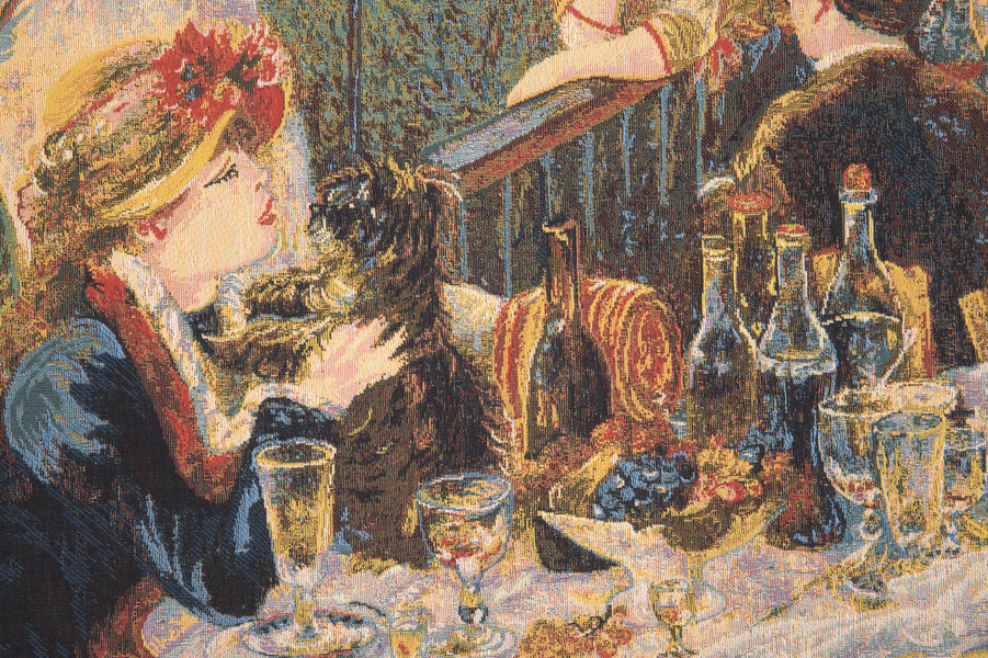 | History: | Luncheon of the Boating Party is a Belgian jacquard woven wall tapestry. The artwork comes from a painting of the same name completed in 1881 by French impressionist Pierre-Auguste Renoir. The painting, combining figures, still-life, and landscape in one work, depicts a group of Renoir's friends relaxing on a balcony at the Maison Fournaise along the Seine river in Chatou, France. The painter and art patron, Gustave Caillebotte, is seated in the lower right. Renoir's future wife, Aline Charigot, is in the foreground playing with a small dog. On the table is fruit and wine. The diagonal of the railing serves to demarcate the two halves of the composition, one densely packed with figures, the other all but empty, save for the two figures of the proprietor's daughter Louise-Alphonsine Fournaise and her brother, Alphonse Fournaise, Jr, which are made prominent by this contrast. In this painting Renoir has captured a great deal of light. |