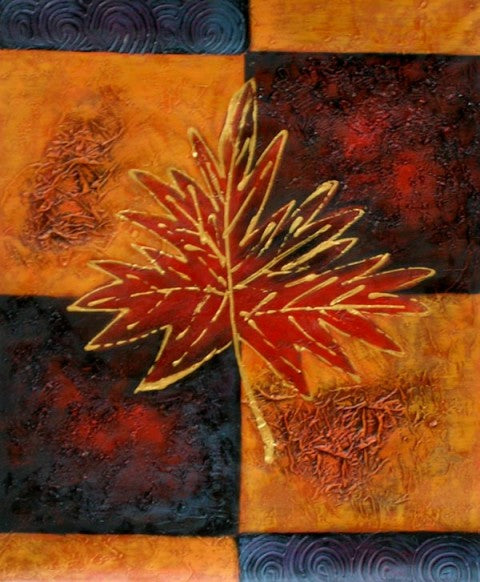 | History: | Maple is a hand finished canvas oil painting. A richly colored patchwork creates a textural backdrop to a centerpiece of a maple leaf of vermilion hue. Contrasting panels that alternate squash and plum colors divide the painting, and further compliment the natural line and placement of the leaf. Inspired by nature, this wall art gives a modern yet homey touch that can bring the colors of autumn into your home décor year round. |