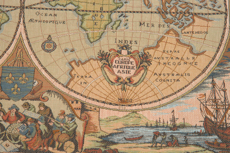 | History: | Maritime Map is a French impressionist jacquard woven tapestry wall hanging from Magellan times. It is a reproduction of a 17th century maritime chart. The maps are detailed by exotic scenes of maritime exploration. This piece is perfect to display in your home, office, or study, as it lends your surroundings a sense of sophistication and worldliness. |