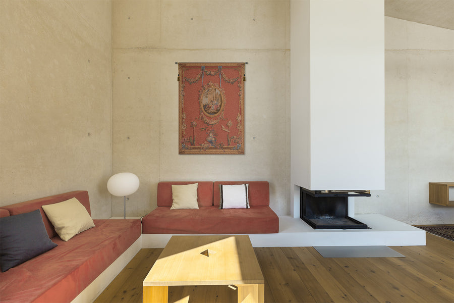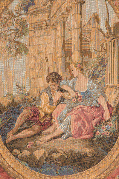 | History: | This French wall art tapestry, Medallion Serenade Rouge, represents a romantic medallion in the style of François Boucher. The design is from a set of tapestries woven at the end of the 18th century at the Gobelins Manufacture. Two lovers are seated inside a wreathed medallion on a damask background, surrounded by flowers. |