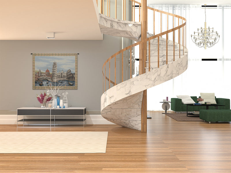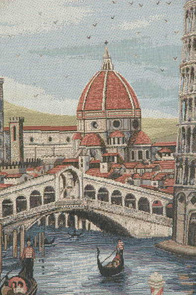 | History: | Monuments, Italy is an Italian jacquard woven wall tapestry. This unique cityscape places together some of the most prominent landmarks of Italian Heritage. Left to right: The Florence Cathedral, The Rialto Bridge, The Tower of Pisa, St Mark's Basilica, and the Colosseum all stand together to form a stunning view with gondolas skimming across the foreground. |