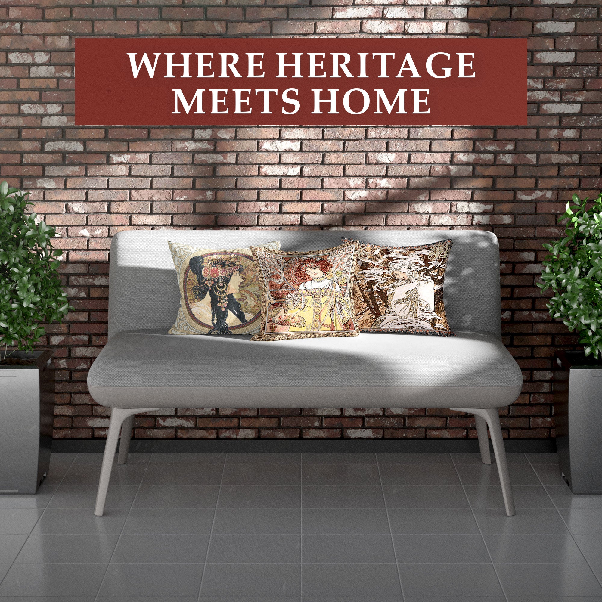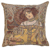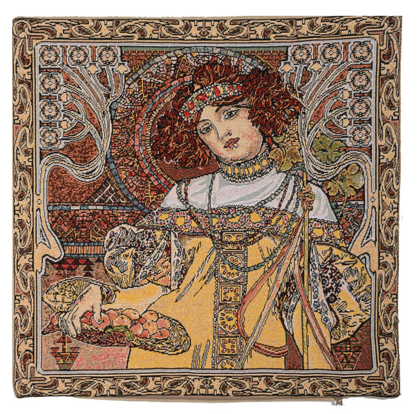 | History: | Mucha Autumn I woven European tapestry cushion cover features the work of artist Alphonse Mucha. One of a series of tapestries depicting the four seasons, “Art Nouveau-Autumn” celebrates the coming of fall. The subject of the piece, a lovely female, is shown holding fruit and an organic scepter in a style that is the very essence of the Art Nouveau art. The detail is amazing on this tapestry. It is based on the groundbreaking work of artist Alphones Mucha (1860-1939) who helped define the Art Nouveau period, which lasted 30 years. A native of Czechoslovakia, Mucha lived in Paris during the height of his career. There, he painted many works, including Panneaux, a series of works designed around a central theme. These were extremely popular during Mucha’s lifetime. “Art Nouveau-Autumn” is from one of these series. |