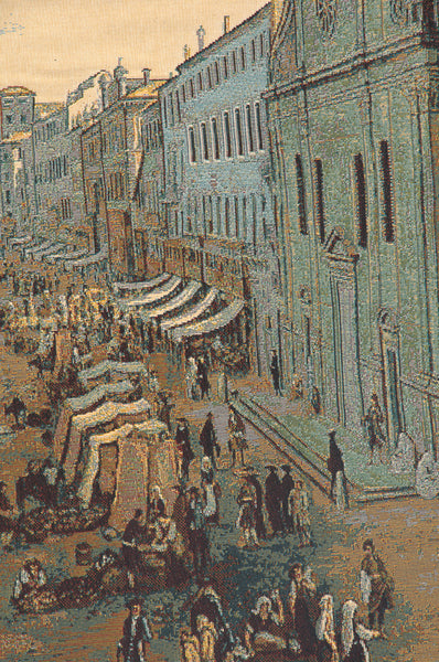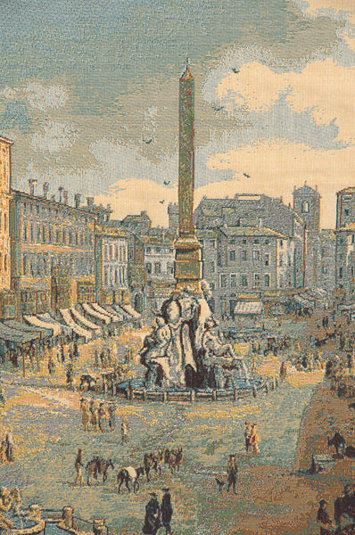 | History: | Navona Square, or Piazza Navona, is an Italian jacquard wall tapestry. It portrays a historical view of the Piazza Navona, a city square in Rome, Italy. It is built on the site of the Stadium of Domitian, built in 1st century AD, and follows the form of the open space of the stadium. The ancient Romans came there to watch the agones (games), and hence it was known as Circus Agonalis, or competition arena. It is believed that over time the name changed to in avone to navone and eventually to navona. |