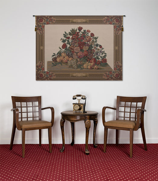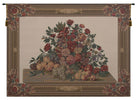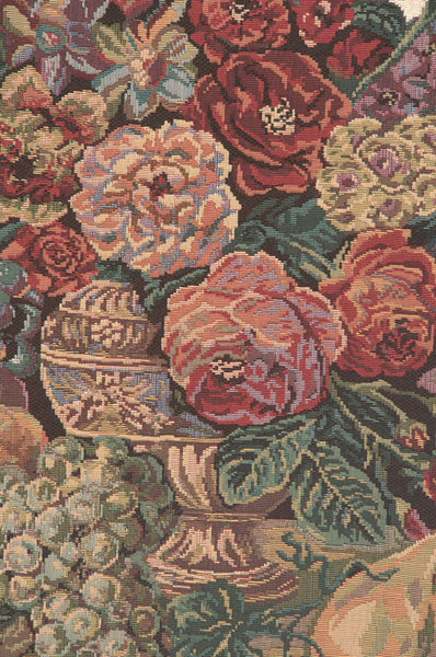 | History: | New Vase tapestry features a still life image with an overflowing vase filled with blooming flowers. A stunning array of delicate and hearty flowers fills this scene with everything from robust roses to delicate orchids sitting above a display of stone fruit scattered below. Tapestry is adorned with an elaborate gold border. |