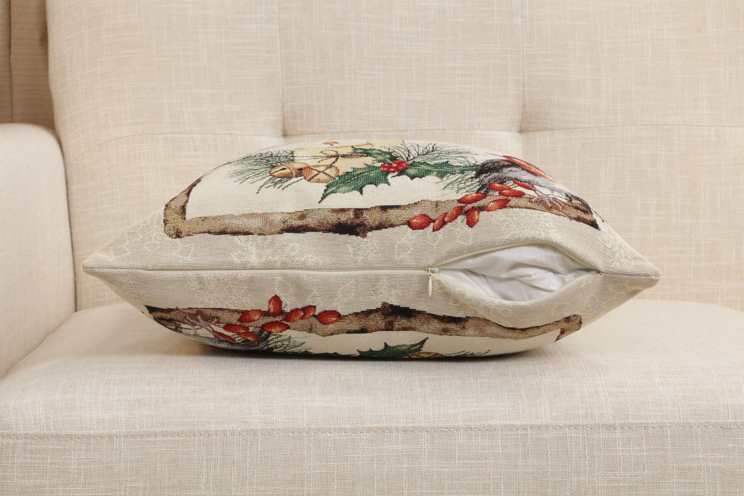 | History: | Celebrate the holiday season with the Noel series tapestry cushion cover. Featuring a sweet robin amongst a design of poinsettias, gold ornaments, and candles, all set against a subtle snowflake patterned background. Interwoven gold threads add a festive shimmer, enhancing the Christmas charm and adding a holiday sparkle. Double-sided with a sturdy construction, this cushion cover transforms your home décor into a joyful celebration, infusing every space with Christmas cheer. |