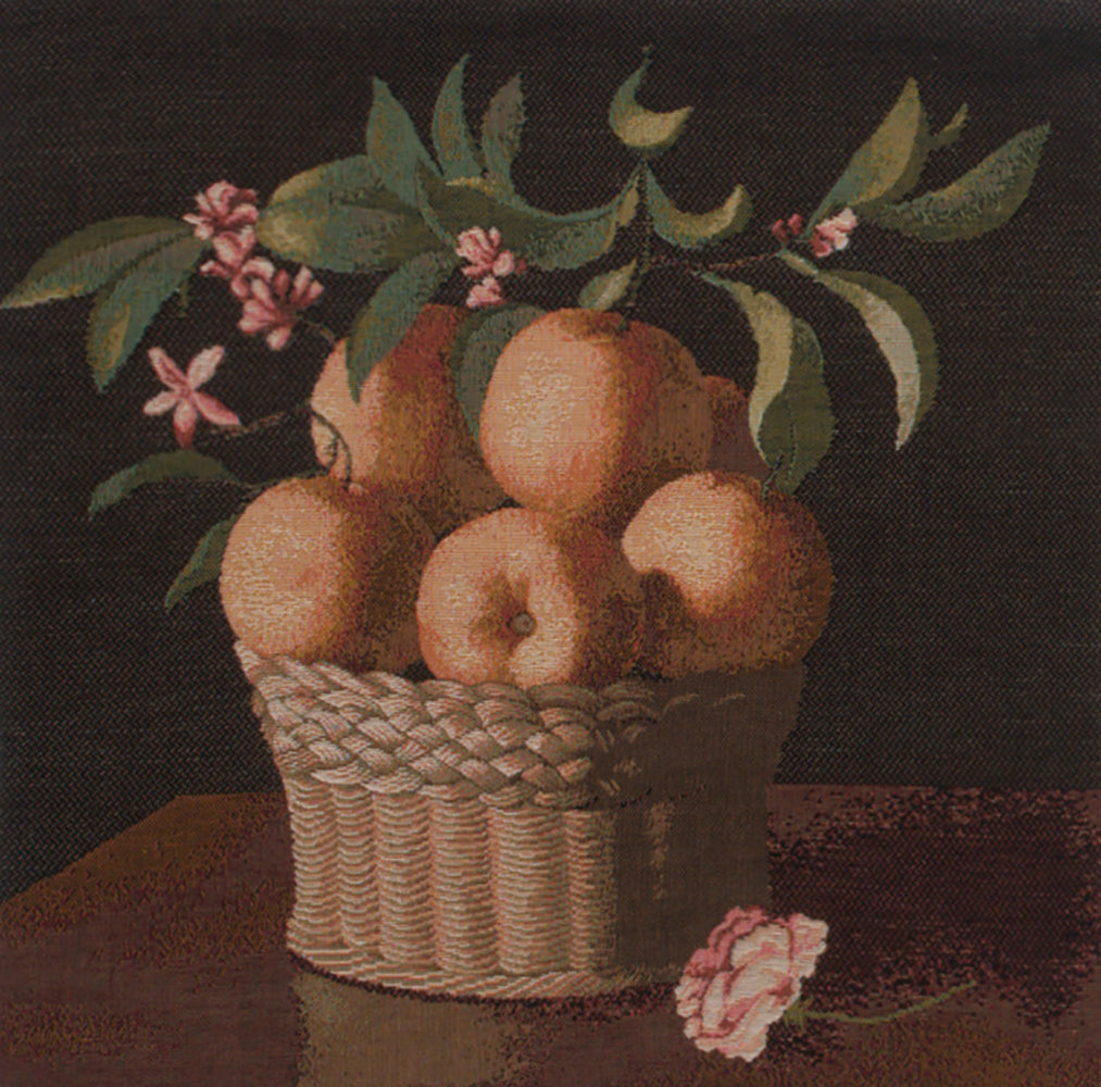 | History: | Orange Basket is an elegant jacquard tapestry cushion cover imported from Europe depicting a basket of oranges accompanied by their vegetation. The gardener has added a freshly picked rose. This still life is on a black background. Also called Basket of Oranges. |