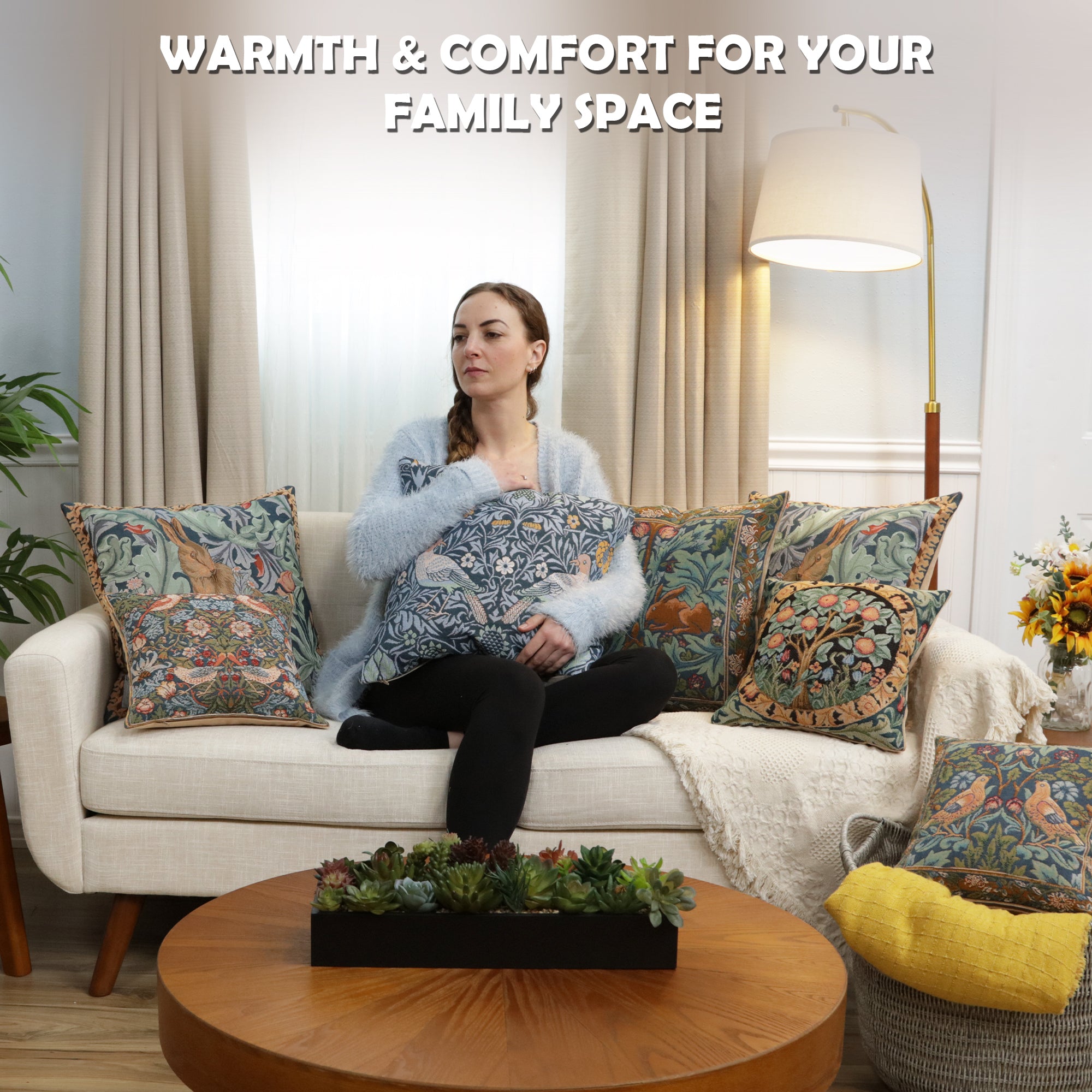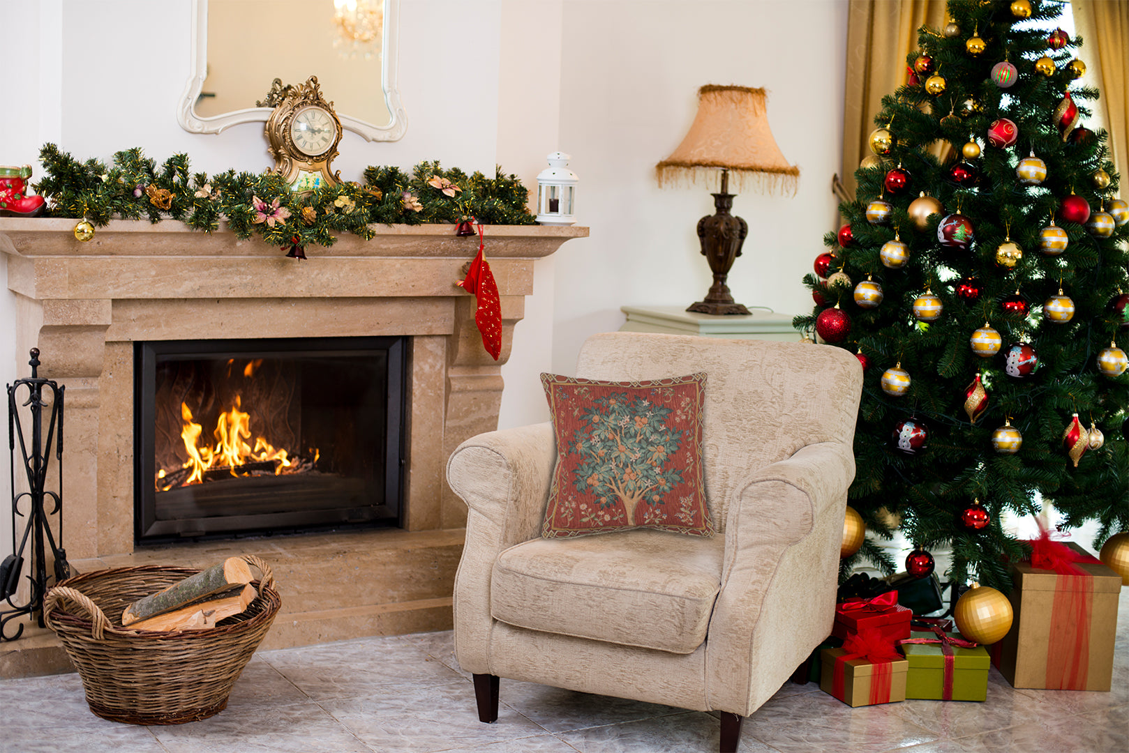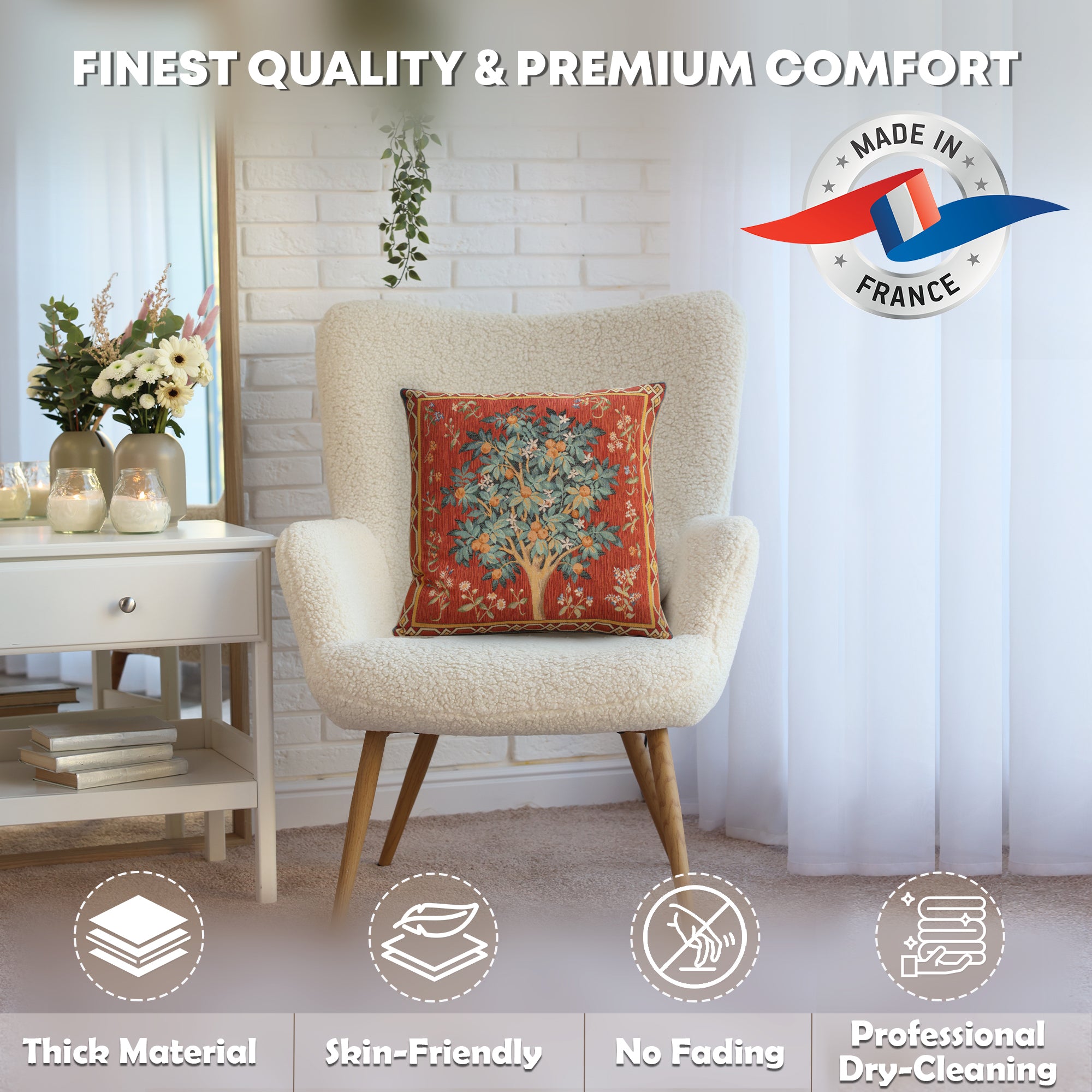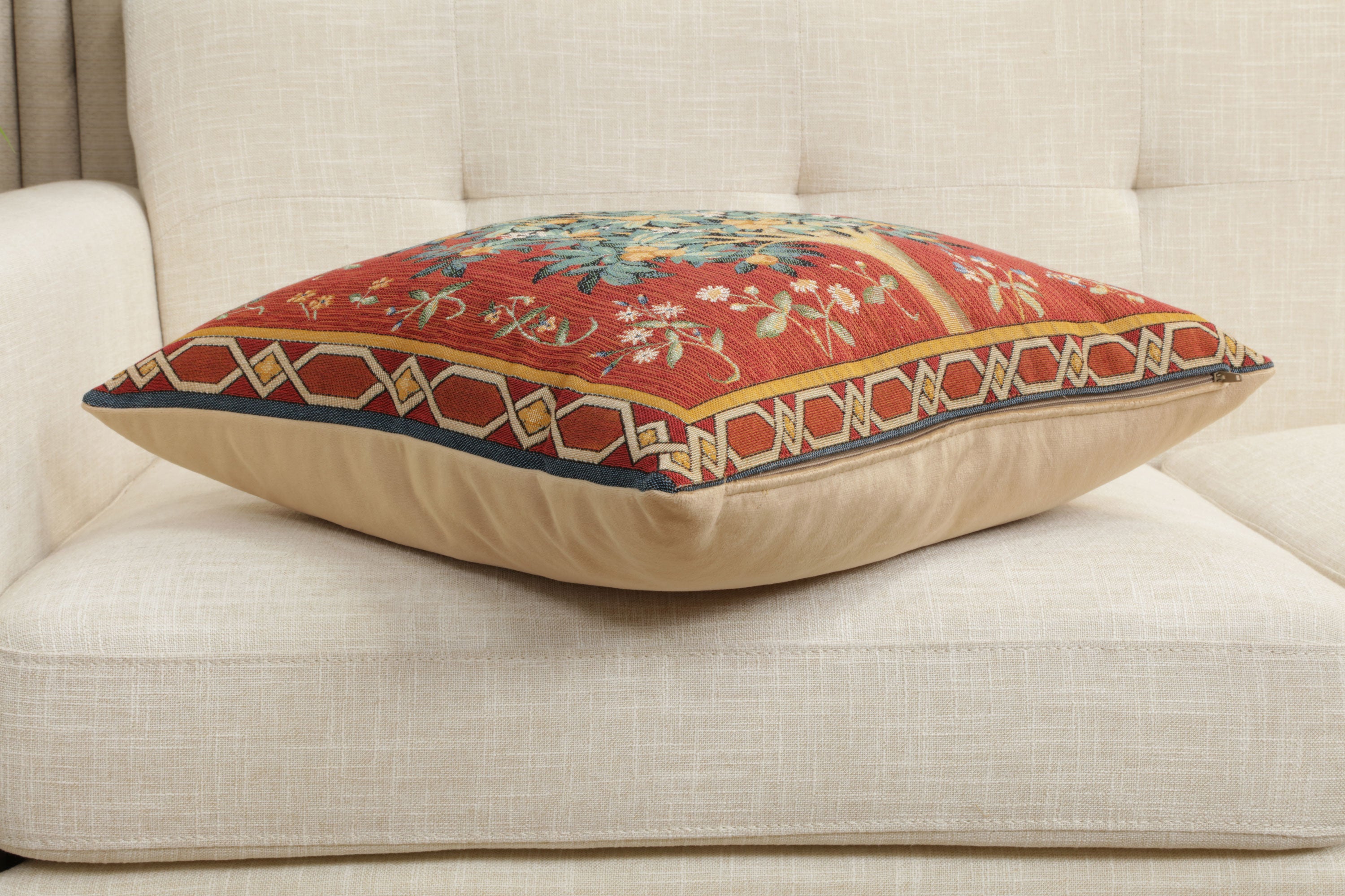 | History: | This European jacquard woven tapestry cushion cover, The Orange Tree, is an extract from the famous set of 6 medieval tapestries Lady and the Unicorn. Woven around 1511, they feature the arms of Jean le Viste and are now housed in the Cluny Museum, Paris. The background is done in the Mille-fleur style. |
