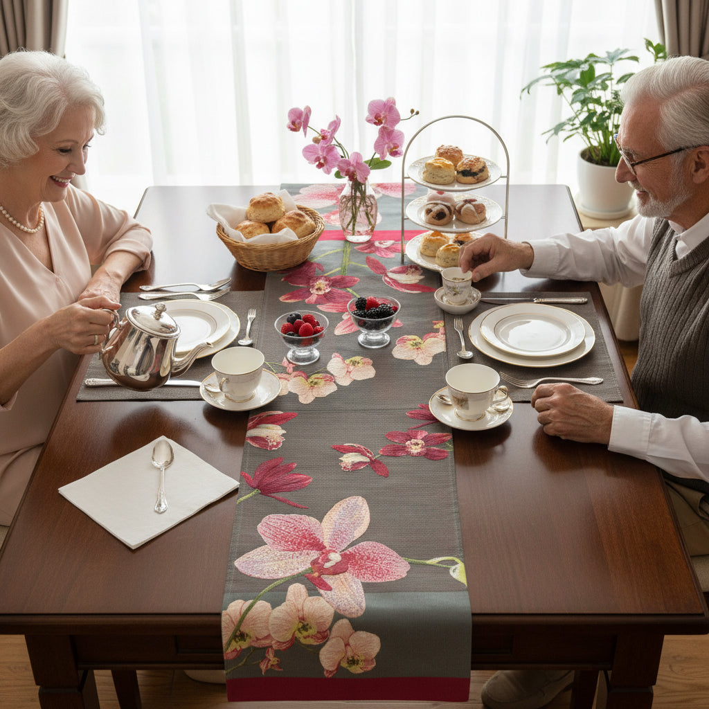 | History: | With their original shape, these orchids will embellish your decoration.This jacquard table runner is woven in cotton, and hemmed all around. |