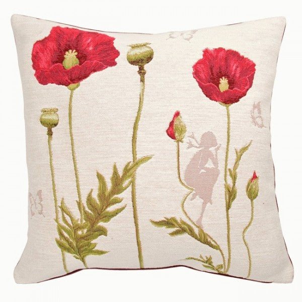 | History: | Long stem poppies with vibrant red petals on a cream backdrop bring a sense of delicate beauty to your home decor motif in this jacquard woven imported tapestry pillow case. |