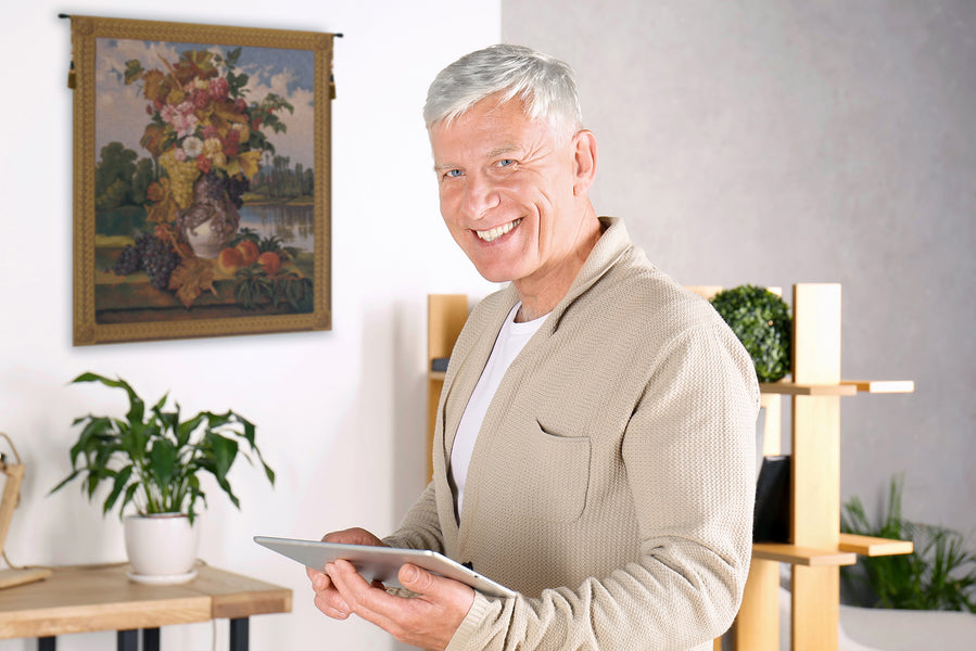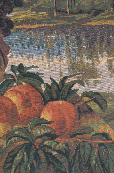 | History: | Reflections is a jacquard woven wall tapestry made in Belgium. This tapestry is an adaption from an antique oil painting and features a vase overflowing with flowers and grapes. The vase rests on a terrace surrounded by various fruits. A serene landscape serves as the background for this beautiful still life study. This is the perfect piece to adds to your home decor collection. |