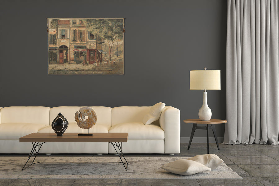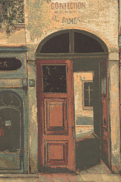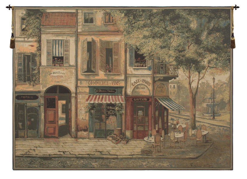 | History: | Rue De Paris is a Belgian jacquard wall tapestry. It portrays a charming Parisian street corner. We see a quaint cafe and wine store on the corner with residences above. A large tree is seen on the footpath. The shutters are open in the homes above the shops to welcome in the warm summer air. A delightful work with a balanced color palette that shows off the daily life in romantic Paris. |