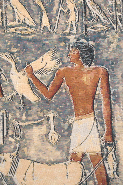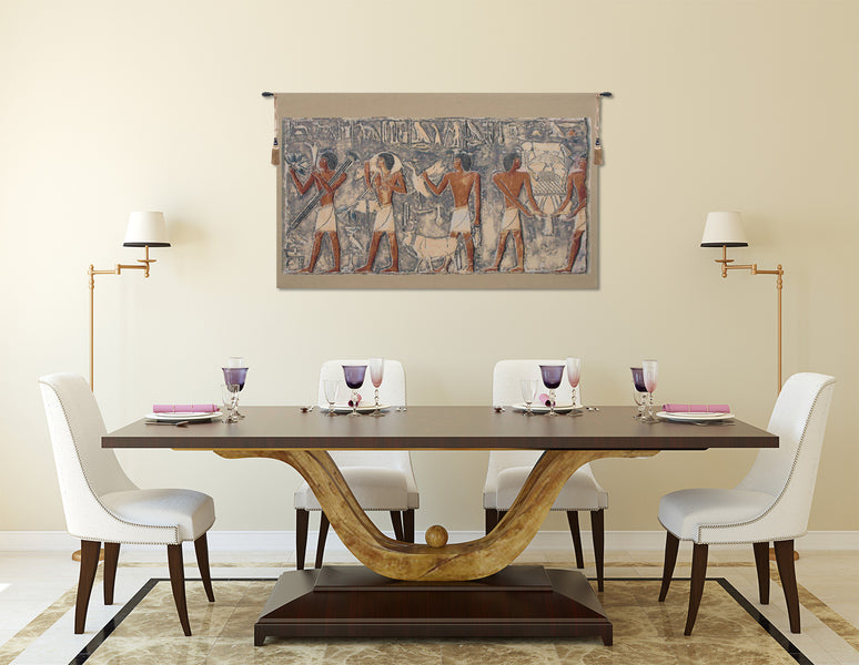 | History: | This wall hanging tapestry, Saqqarah Blue Part 1, is jacquard woven in Belgium. It represents the giving of sacrifices to the deceased Pharoh. The original artwork is displayed on the tomb of Ptahotep (or Ptah-hotep) in Sakkarah. It dates from the Ancient Egyptian Empire 2650-2150 BCE. Saqqara (or Sakkara, Saqqarah, Sakkarah) is a vast, ancient burial ground in Egypt, featuring the world's oldest standing step pyramid. The perfect addition to your home decor motif. |