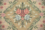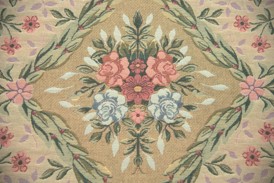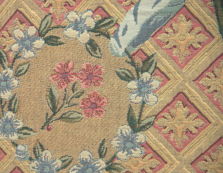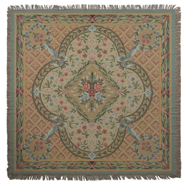 | History: | Savonnerie II woven European tapestry throw features a beautiful soft floral design. With a border of dark cream and diamond shapes, there is a diamond shape in the center with a small bouquet of red and blue flowers. This throw has an old colonial feel. |