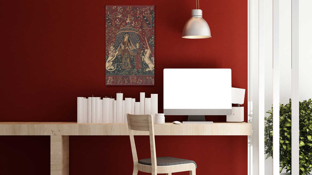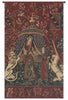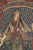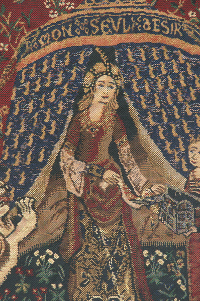 | History: | Lady and the Unicorn Belgian tapestry is one of many in the "Lady and the Unicorn" (La Dame A La Licorne) series. The lady stands in front of a tent, across the top which reads "A Mon Seul Désir" (To my only desire). Her maidservant stands to the right, holding open a chest. The lady is placing the necklace she wears in the other tapestries into the chest. To her left is a low bench with bags of coins on it. The unicorn and the lion stand in their normal spots framing the lady while holding onto the pennants. This tapestry has elicited a number of interpretations. One interpretation sees the lady putting the necklace into the chest as a renunciation of the passions aroused by the other senses, and as an assertion of her free will. Another sees the tapestry as representing a sixth sense of understanding. Other various interpretations see the tapestry as representing love or virginity. |