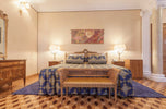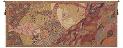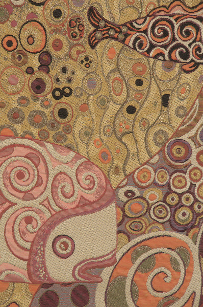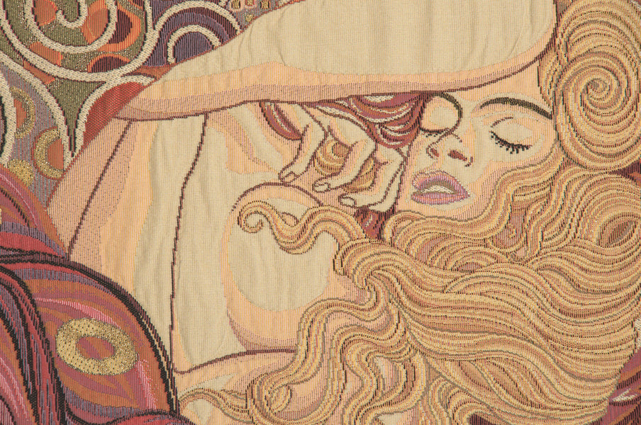 | History: | Unmistakable in its style, this Italian jacquard woven wall tapestry, Sleeping Danae, is based on the work of Gustav Klimt (1862-1918). The Sleeping Danae by Klimt portrays a legendary figure of Danae, who was visited by Zeus in the form of golden shower after which she became pregnant. Klimt used the red or golden haired femme fatale on many occasions, to represent the ecstasy of love and here we see the golden haired lady sleeping. Sumptuous reds, gold, and crimson create water-like eddies along with fish and water plants to create a surreal underwater scene. The use of patterns and color in a florid fantasy like style is a hallmark of his work. Born in Baumgarten, Vienna, in Austria, he attended the Vienna School of Arts and Crafts, and developed his style over this period |