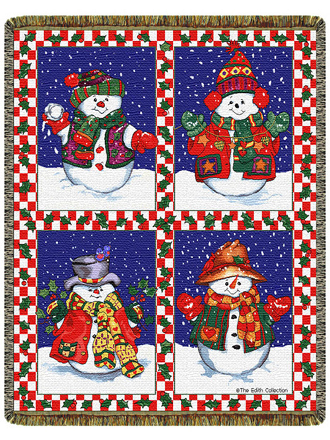 | History: | Snowman's Holiday 68" North American Made Tapestry Throw Four Decorative Snowman Scenes in the snow |