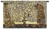 | History: | Stoclet Frieze Tree of Life woven tapestry features the work of the famous artist Gustav Klimt. Stoclet Frieze Tree of Life tapestry shows the tree of life by Gustav Klimt. Here we see the curved branches of Klimt's unmistakable tree of life, as well as the embraced woman from Klimt's famous Accomplishment. The color palette is beautiful and cohesive with beiges, browns, whites and blacks. This work celebrates the greatest of Klimt's hallmark works. |