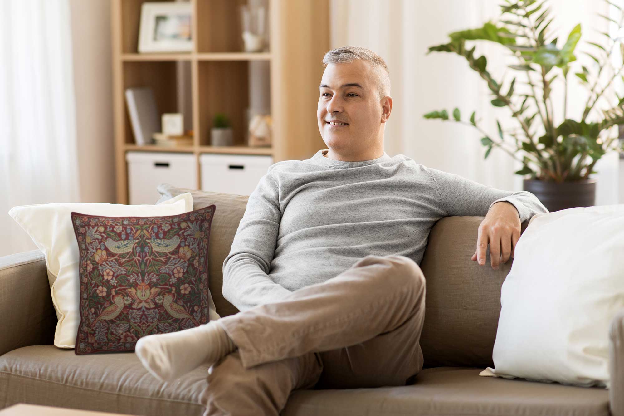 | History: | Fall into a magical nature scene with mischievous birds stealing berries right from the vine. Taken from a tapestry designed by William Morris in the late 1800s that includes the extract of the birds in the wild on this delightful cushion cover. The period inspired tapestry design depicts colorfully feathered birds perched on strawberry vines set against wild bushes and greenery. Morris founded the British arts and crafts movement during the late 1800s. Makes a sweet decorative accent on the bed or sofa. Cushion cover backed with lining and zipper. Infill not included. Woven in France. |