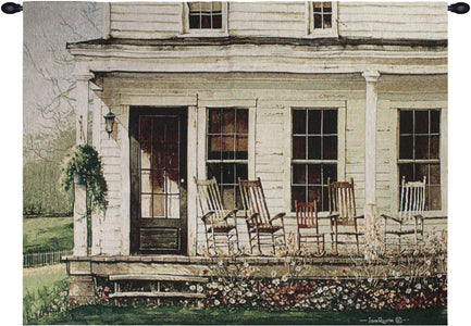 | History: | Sunday Afternoon tapestry features the work of artist Betsy Brown. The artist has depicted a large front porch of a home that is elaborately done with plush furniture, green foliage and chandelier hanging above. |