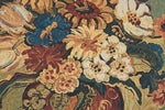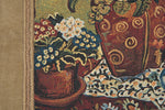 | History: | Sunflowers At Window features a still life floral arrangement complete with sunflowers, daisies and orchids in an elaborate red vase surrounded by a beige border and fringe along the bottom. |