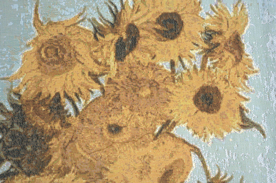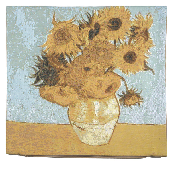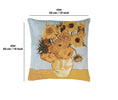 History: Sunflowers by Van Gogh is a French jacquard woven tapestry cushion cover. The artwork is a reproduction of Vincent Van Gogh's oil painting Twelve Sunflowers in a Vase. It was painted at Arles in August 1888 and is now in a Munich museum. It is part of a set that he completed between 1888 to 1889, consisting of seven paintings representing sunflowers in all their life-cycle, from flowering to wilt.