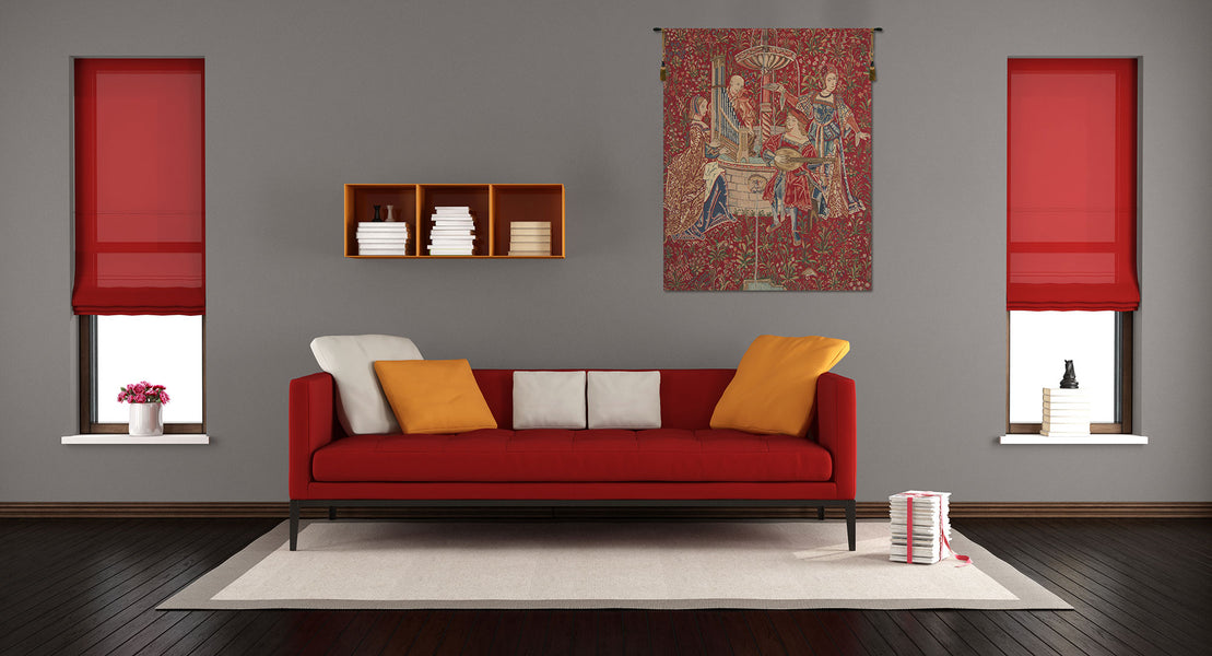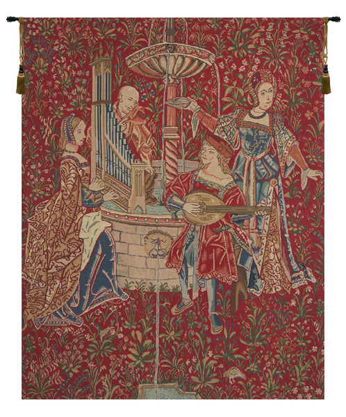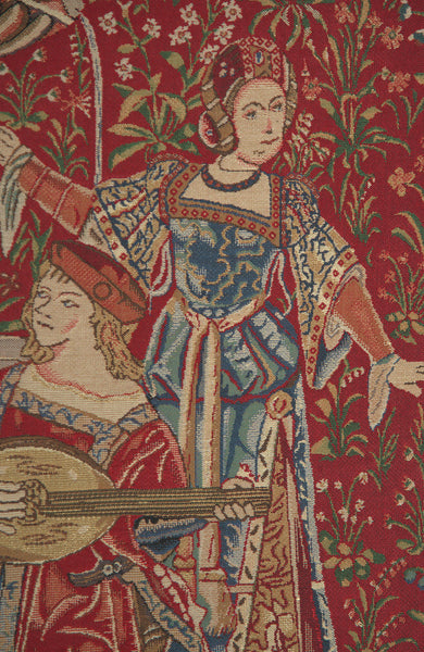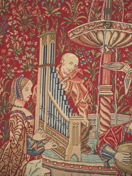 | History: | The Concert Belgian tapestry shows a scene of music and song, from the medieval period. Filled with medieval style, this work shows an organist, a lutist, a violinist and singers enjoying the past time of music. Medieval art was filled with subjects of everyday life including their past times. Their garments are elaborate and richly decorated, a sign f their nobility. A mille fleur or thousand flower background so typical of art in the middle ages is seen here. |