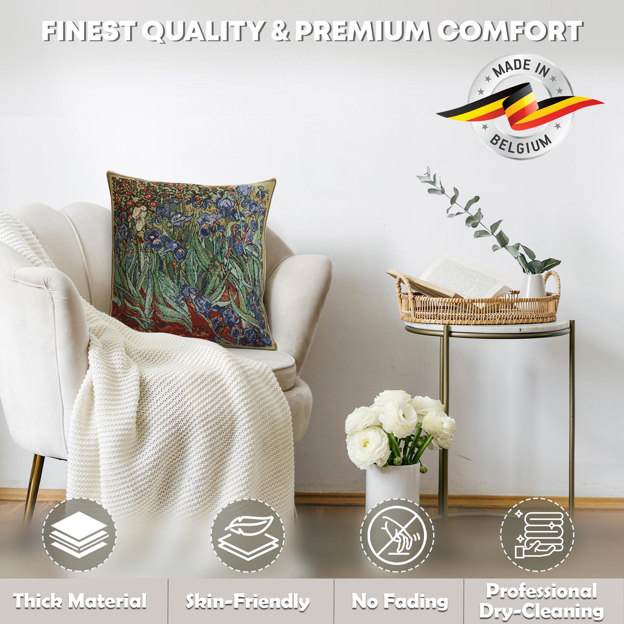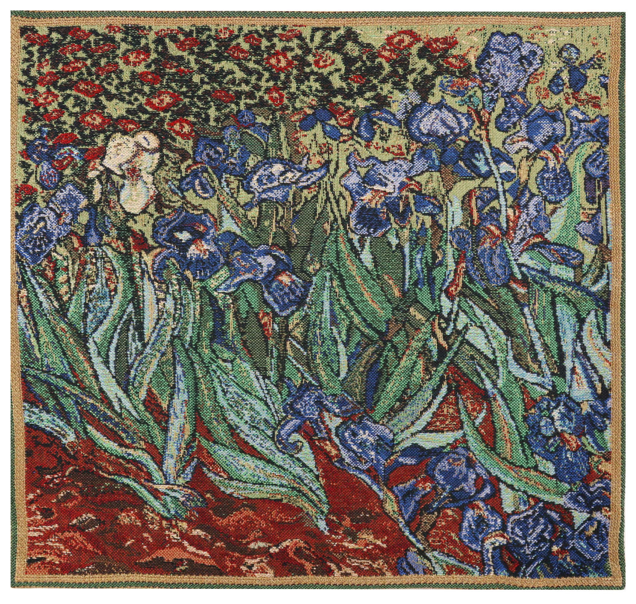 | History: | The Iris I Belgian tapestry cushion cover is inspired by the work of the famous painter Vincent Van Gogh. This wall tapestry is from Vincent Van Gogh's painting of May 1889. He was then in the asylum at Saint Paul-de-Mausole. It is now in the Paul Getty Museum having sold in 1987 for $53.9 million. |