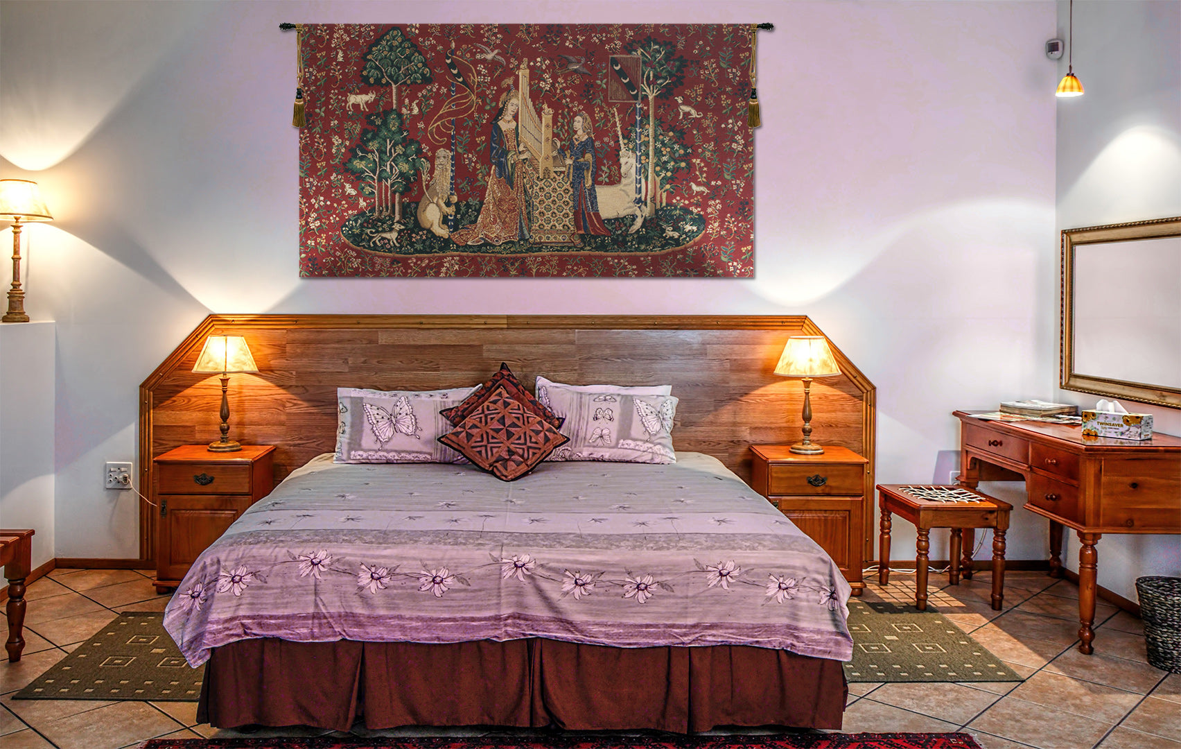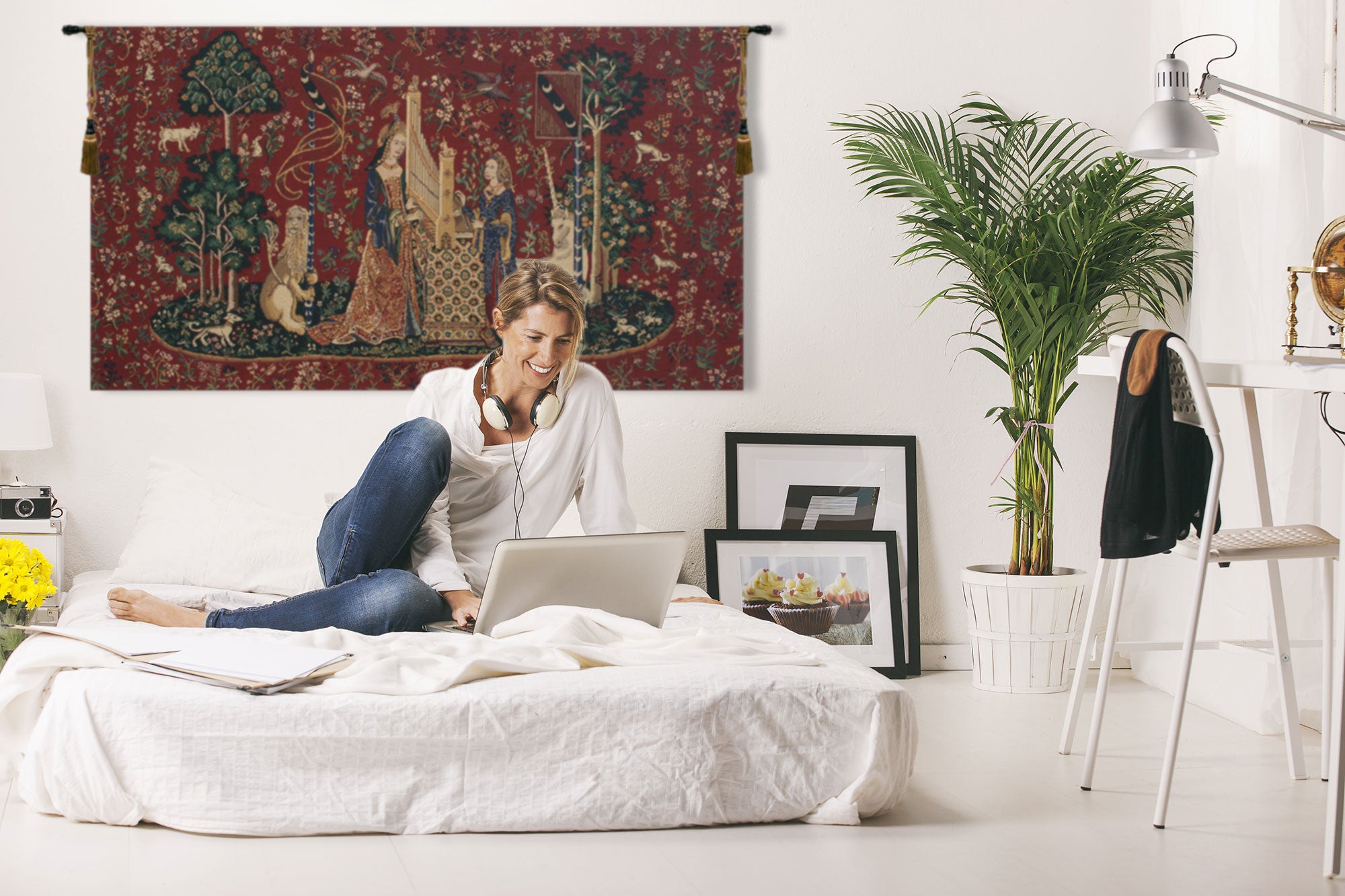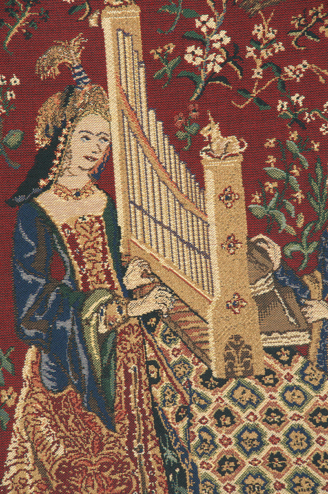 History: Lady and the Organ II Belgian tapestry is one of the six tapestries in the "Lady and the Unicorn" series. This tapestry represents the sense of hearing. The lady plays a positive organ on top of a table covered with a Turkish rug. Her maidservant stands to the opposite side, and holds the organ in place. The lion and unicorn once again frame the scene holding up the pennants, but in this scene, their positions are reversed so that they are inside the frame, and each is on the opposite the side of the lady that they are on in all the other tapestries.