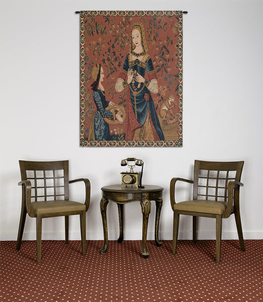| History: | The Smell II is a European jacquard wall tapestry. The artwork comes from a fifth century tapestry of the Medieval Lady and the Unicorn Series of the Five Senses. This tapestry represents smell. Likely from the school of Bruges for Jean Le Viste. The original tapestry is displayed at the Cluny Museum in Paris. |