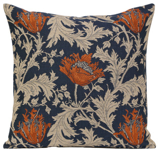| History: | The Tulip by William Morris woven European tapestry cushion cover features the work of the famous artist William Morris. We see an oblong blue vase, the roses, carnations, and foliage coming from it in the true wispy William Morris style. |