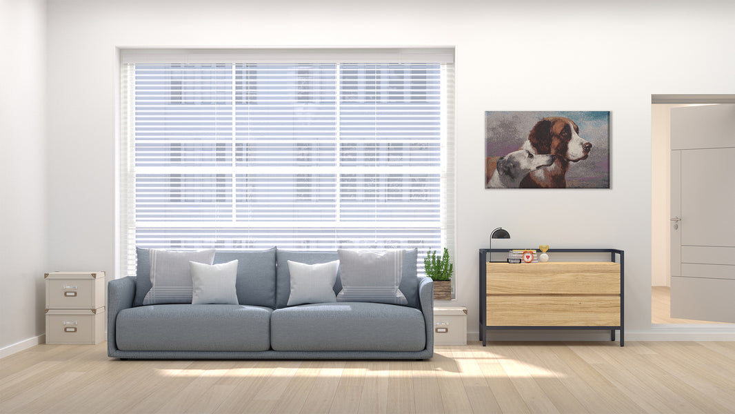 | History: | Trust is a woven tapestry stretched wall panel depicting two dogs side by side, the smaller one looking up toward the larger canine with a look of trust. This tapestry is a wonderful accent to your home, office, or cabin. |
