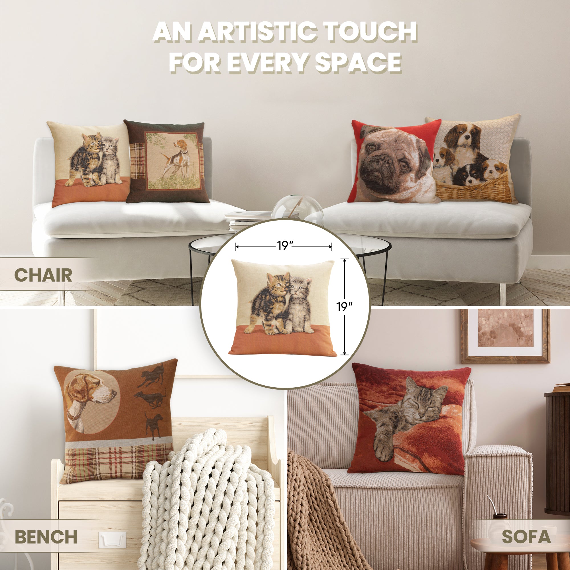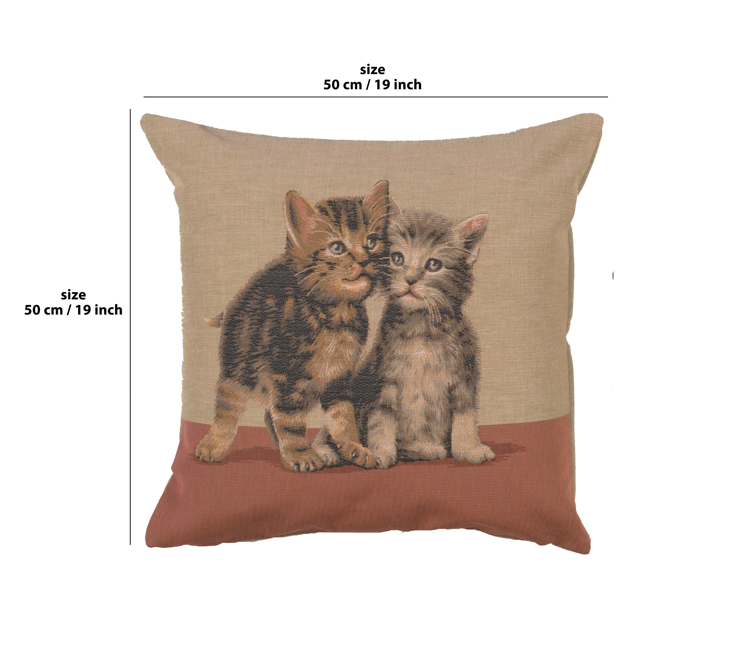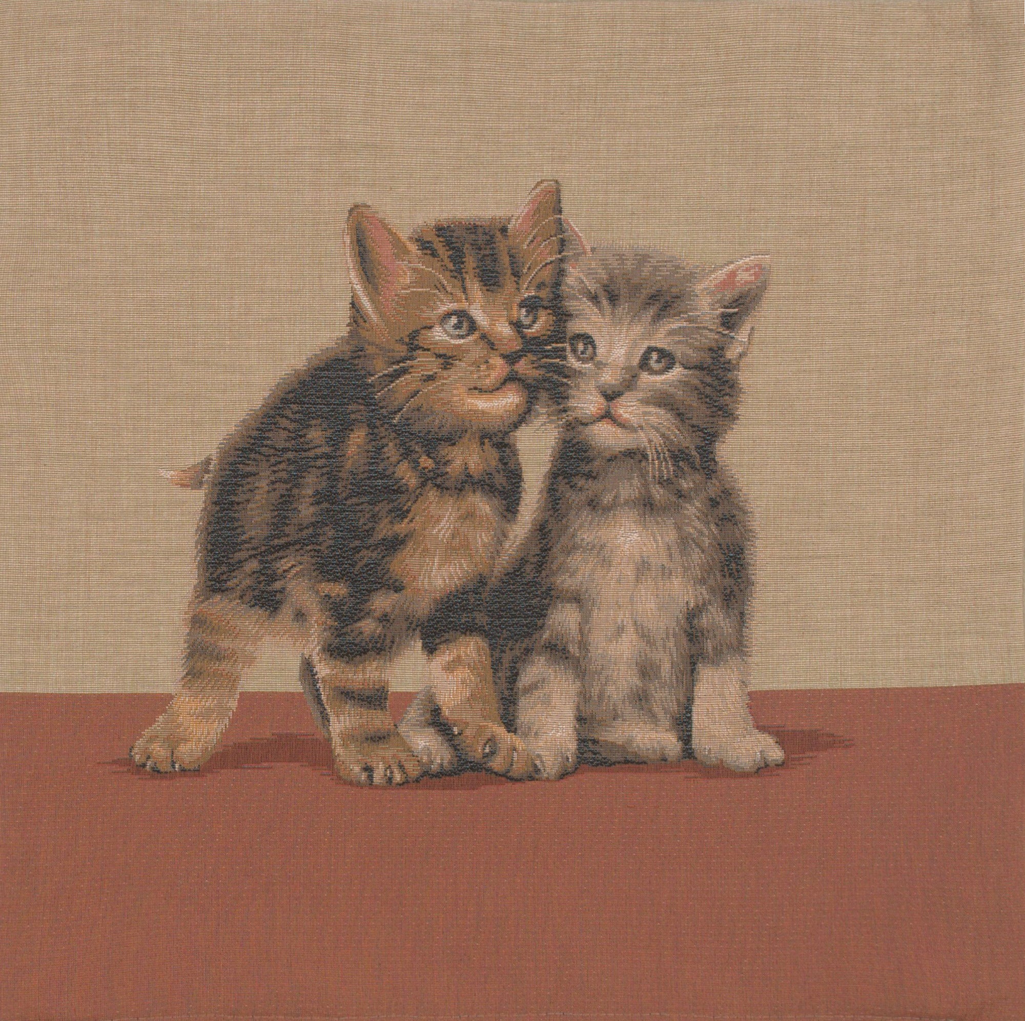 | History: | Two adorable kittens are the theme of this lovely European jacquard tapestry cushion cover. Kittens bring out your inner child, playfulness, and represent the need to have more fun, and nurture yourself and your sense of play. Two Kittens features one orange and one gray tabby on a cream and red background. |