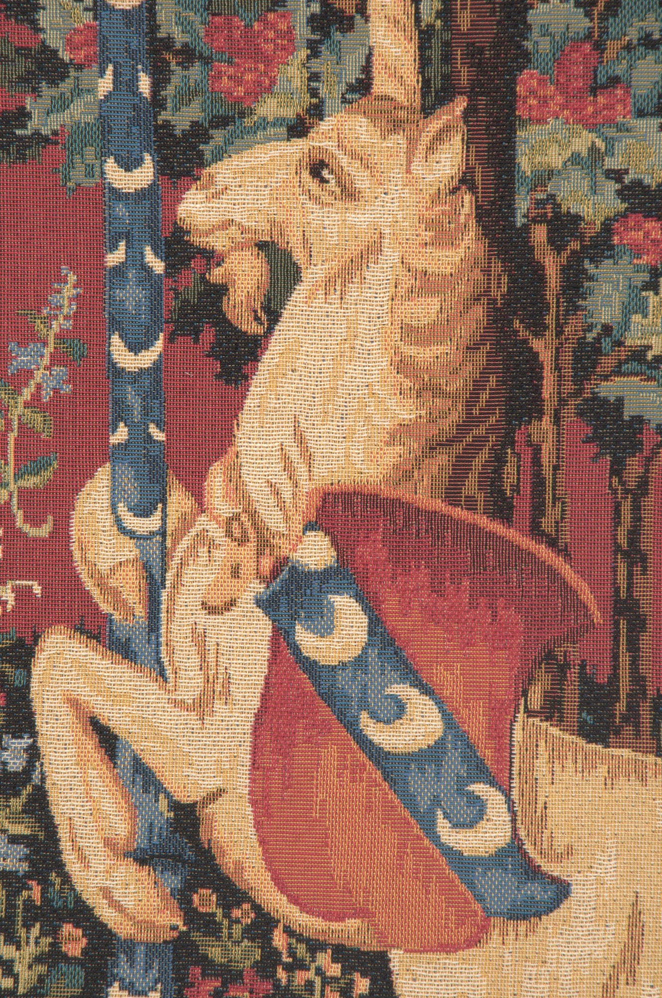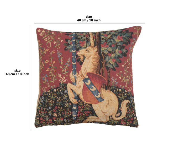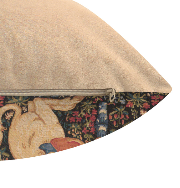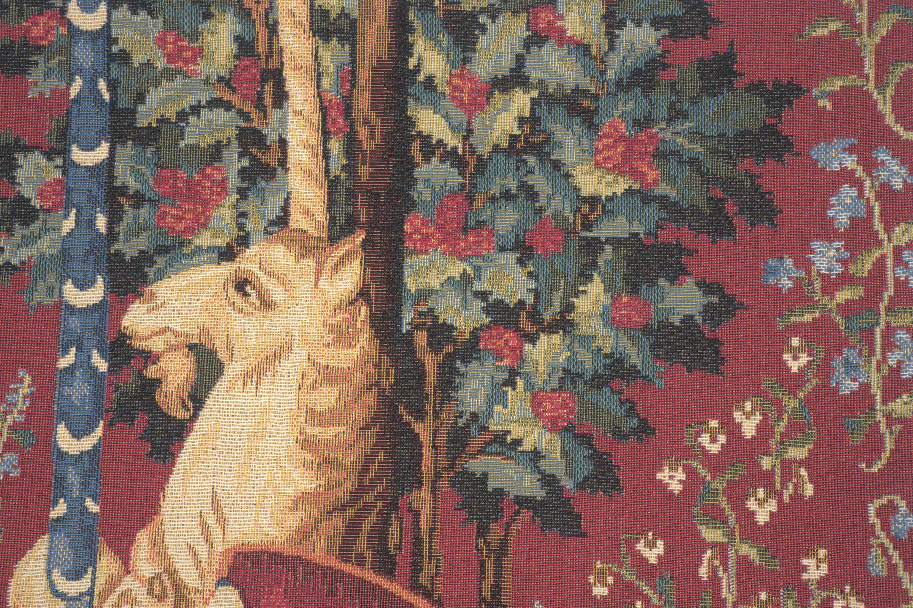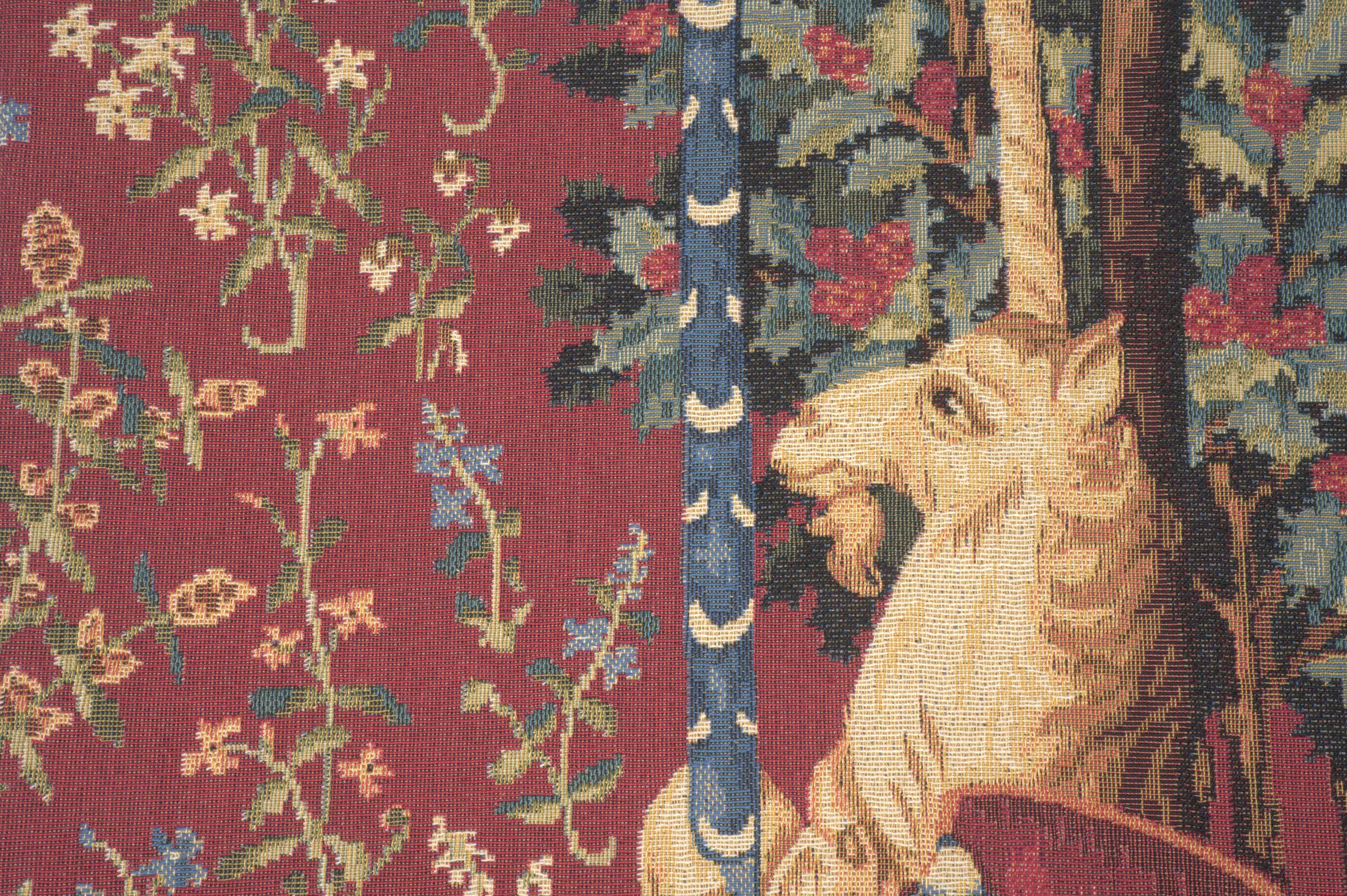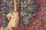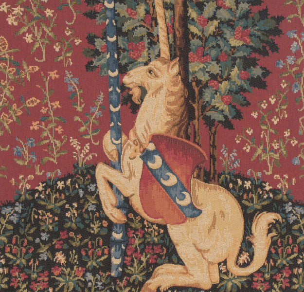 | History: | Unicorn Sitting woven European tapestry cushion cover features a scene from the "Lady and the Unicorn" series of Belgian tapestries. In this majestic scene we see the unicorn detail from the Lady and the Unicorn series. Here the unicorn is decorated with the emblem of the Le Viste family to whom it is thought the work was dedicated to. A regal tapestry to transform any room to the wonderful elegance of this period of unicorn art. |
