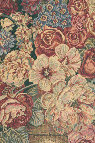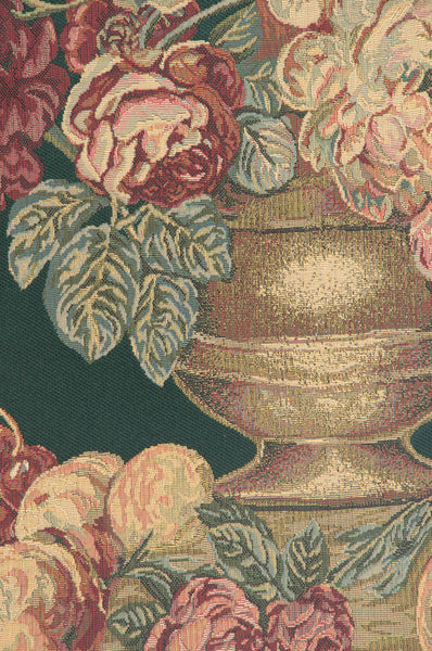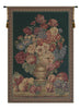 | History: | Mini Vase tapestry features a still life image with an overflowing urn filled with blooming flowers. A stunning array of delicate and hearty flowers fills this scene with everything from robust roses to delicate orchids sitting above a display of stone fruit scattered below. |