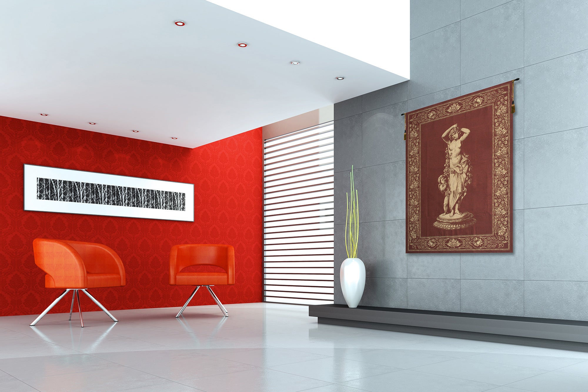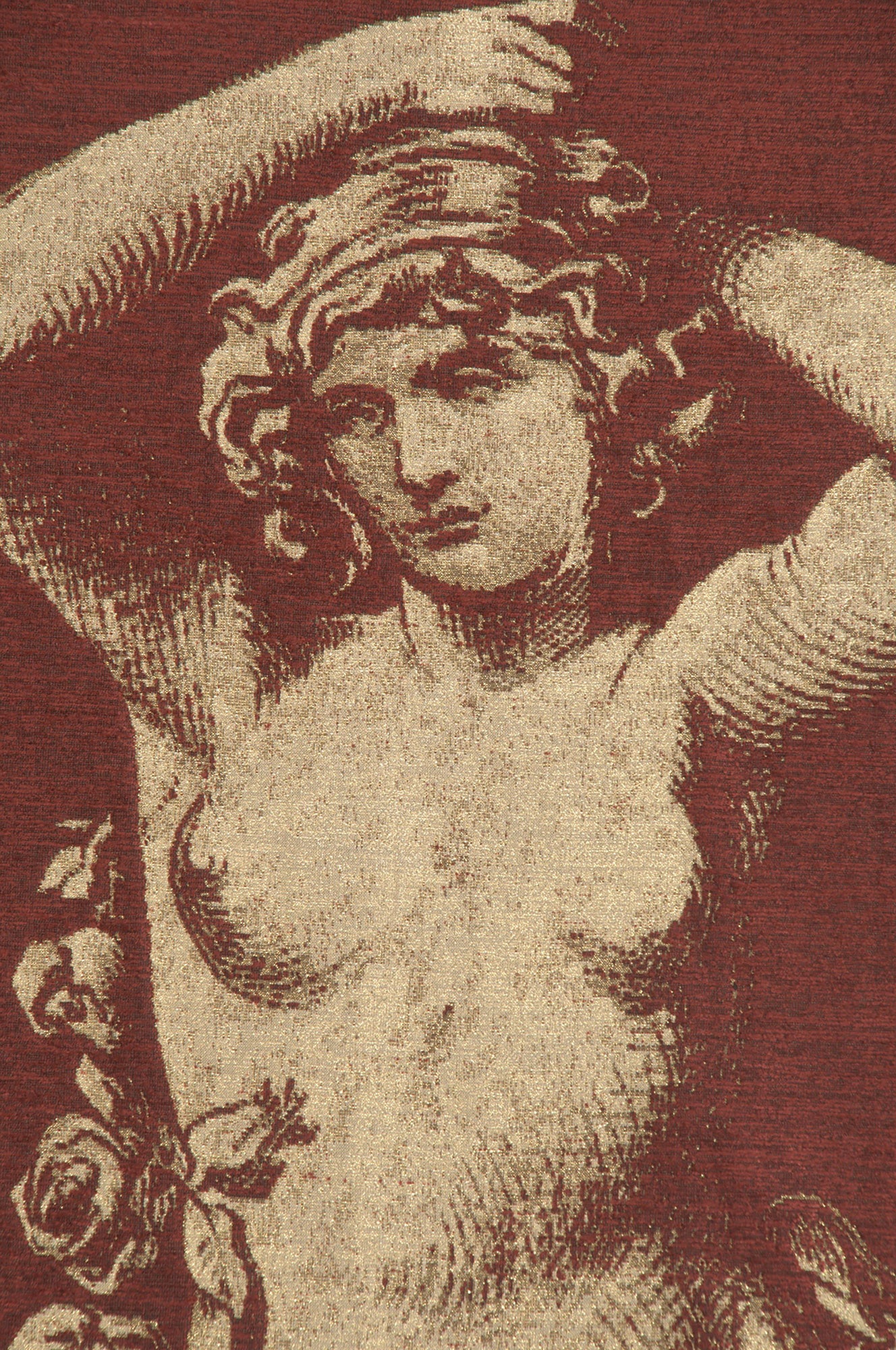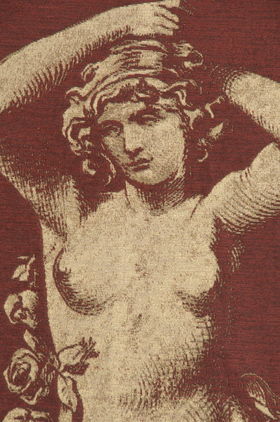 | History: | Venus Belgian chenille tapestry features a rendition of the "Birth of Venus" statue by Botticelli. We see a half naked Venus standing on a half shell with a small cherub looking around her. The background is done in rouge with an intricate white border. |