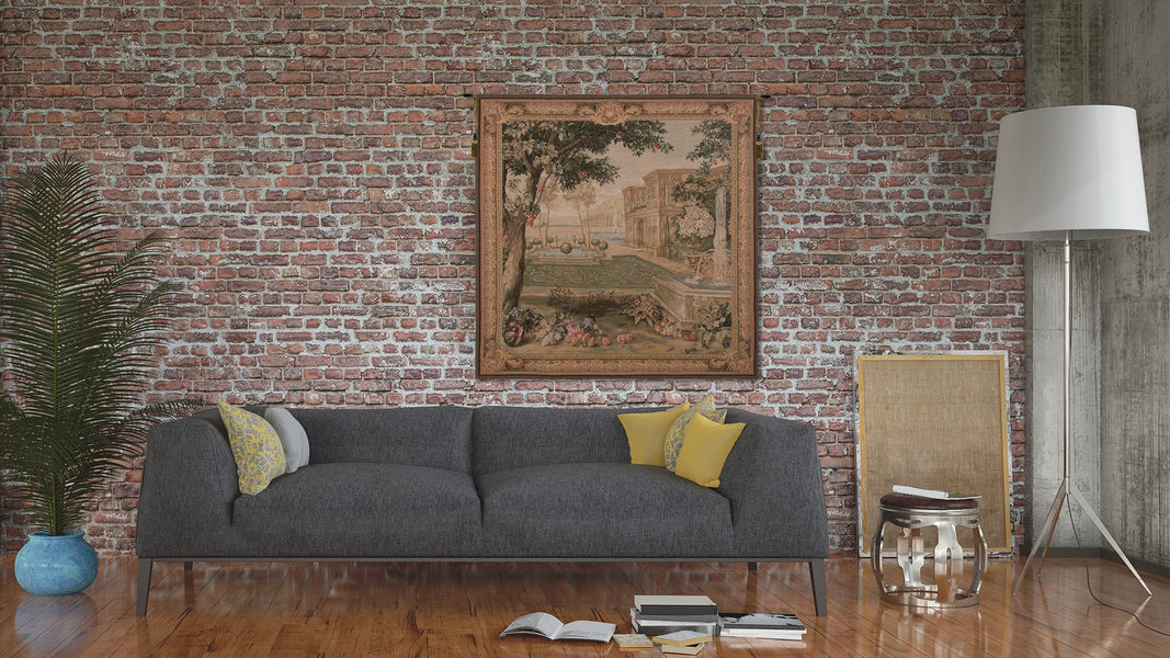 | History: | Verdure Fontaine Carree: this French jacquard woven wall tapestry was inspired from a Flemish Oudenaerde tapestry, Venus and Adoni, very popular from the end of the 18th century. This version features the fantastic landscape, and shows us a provocative array of colour. It is surrounded by a filigreed floral border. |