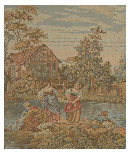 | History: | Washing by the Lake Vertical is an Italian jacquard woven wall tapestry. The artwork comes from a series painted by Francois Boucher (1703-1770), and shows women washing clothes by a lake, a typical pastoral activity that was popular in the Rococo era. Boucher was a French painter in the Rococo style, known for his idyllic and voluptuous paintings on classical themes, decorative allegories, and pastoral scenes. He was perhaps the most celebrated painter and decorative artist of the 18th century. He also painted several portraits of his patroness, Madame de Pompadour. |