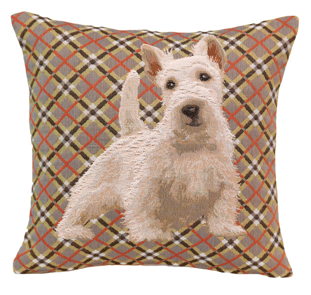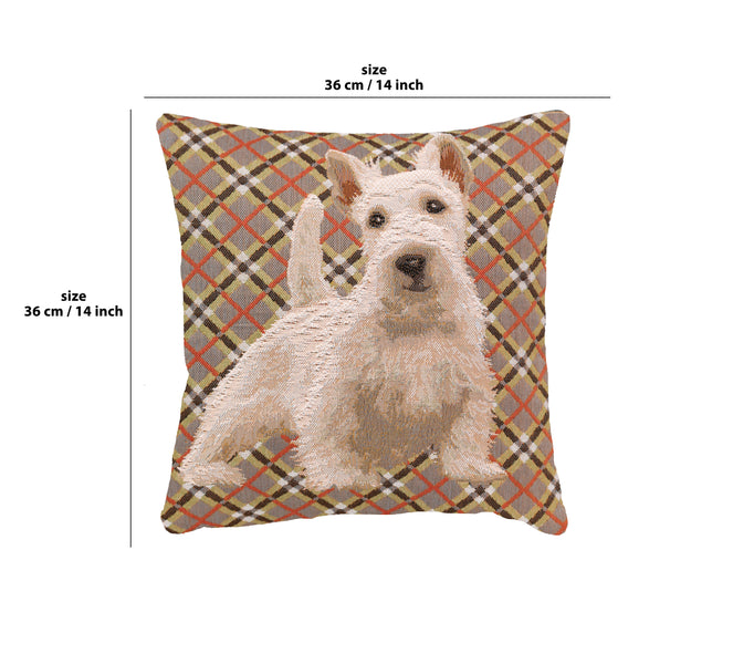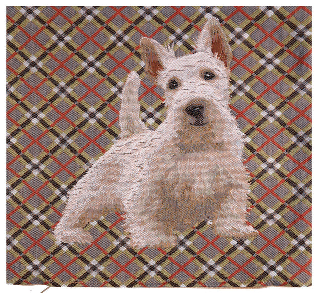 | History: | Imported jacquard woven tapestry cushion cover of precious Scottie Dog over a traditional plaid backdrop adds a certain special charm to your home decor motif. |